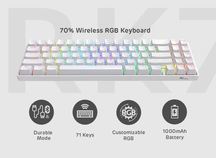 he Royal Kludge RK71 Wireless RGB Mechanical Gaming Keyboard is a compact, feature-rich keyboard designed for gamers, professionals, and anyone who wants a premium typing experience in a space-saving layout. With a 70% form factor and 71 keys, the RK71 retains all essential keys including standalone arrow and function keys while minimizing desk footprint — ideal for small setups and mobile workstations.